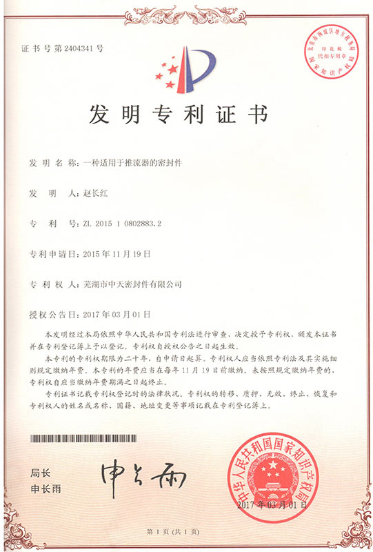 一種適用于推流器的密封件專利證書(shū)